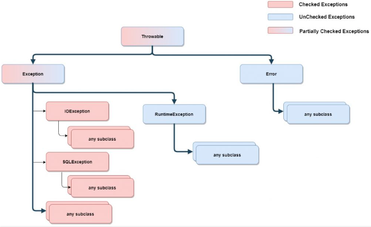 ์๋ฐ์์ ์์ธ๋ Checked(inherited from Exception) / Unchecked(inherited from RuntimeException) ๋ ์ค ํ๋์ด๋ค.