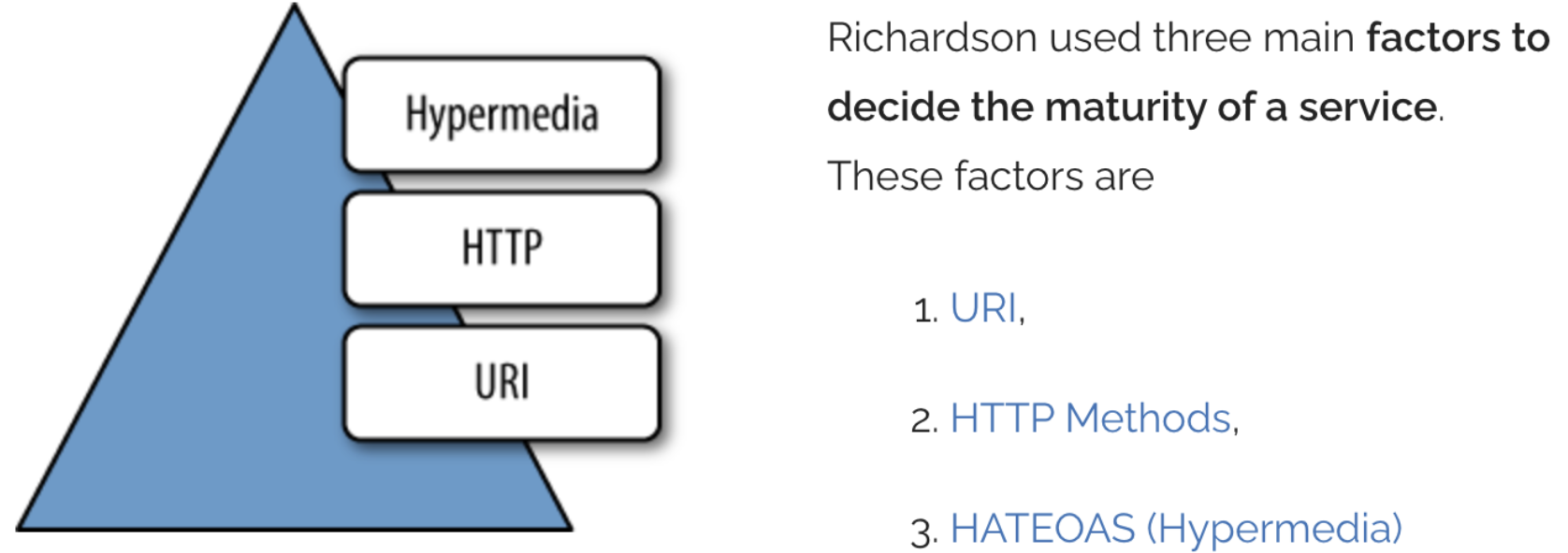 Richardson์ ์๋น์ค์ ์ฑ์๋๋ฅผ ๊ฒฐ์ ํ๊ธฐ ์ํด ์ธ ๊ฐ์ง ์ฃผ์ ์์(⇒ URI, HTTP ๋ฉ์๋, HATEOAS(ํ์ดํผ๋ฏธ๋์ด))๋ฅผ ์ฌ์ฉํ๋ค. ์๋น์ค๊ฐ ์ด ์์๋ฅผ ๋ ๋ง์ด ์ฌ์ฉํ ์๋ก ๋ ์ฑ์ํด์ง๋ ๊ฒ์ผ๋ก ๊ฐ์ฃผํ๋ค.