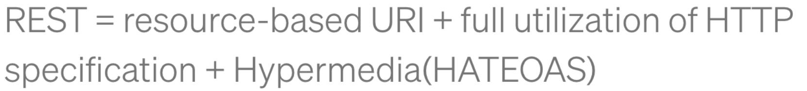 - URI, HTTP, HATEOAS(Hypertext As The Engine Of Application state) ์ธ ๊ฐ์ง ๋ชจ๋ ์ฌ์ฉ